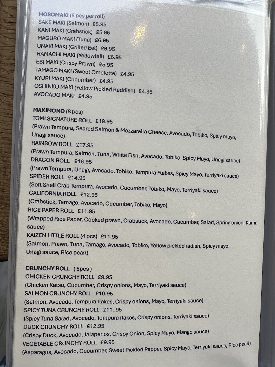 What truly stands out at Tomi Sushi Bar is the amazing array of sushi options. Their Hosomaki delights, like the Sake Maki (£6.00) and Kani Maki (£5.50), are must-tries, along with the impressive Makimono creations, such as the vibrant Rainbow Roll (£12.00) and the scrumptious Spider Roll (£11.00). Add in side dishes like Edamame (£3.00) and Miso Soup (£2.50), and you're looking at a well-rounded culinary adventure without breaking the bank!